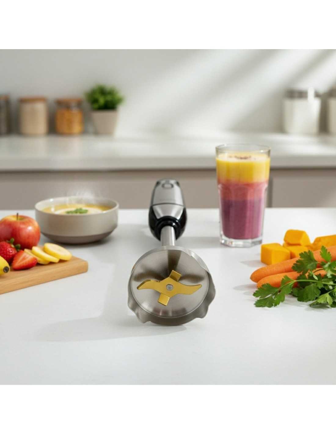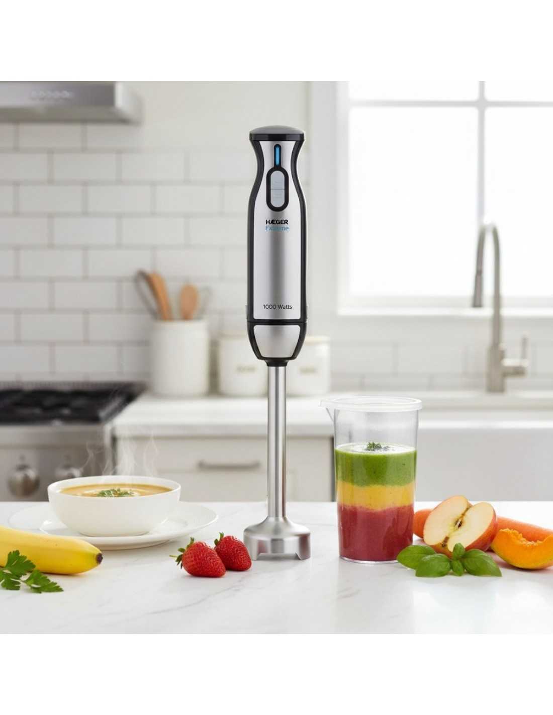 Batidora de mano HAEGER EXTREME con 1000W de potencia, 2 velocidades, 2 interruptores, función turbo, cuchilla en titanio de 5,4cm, pie de acero inoxidable de 22,5cm.